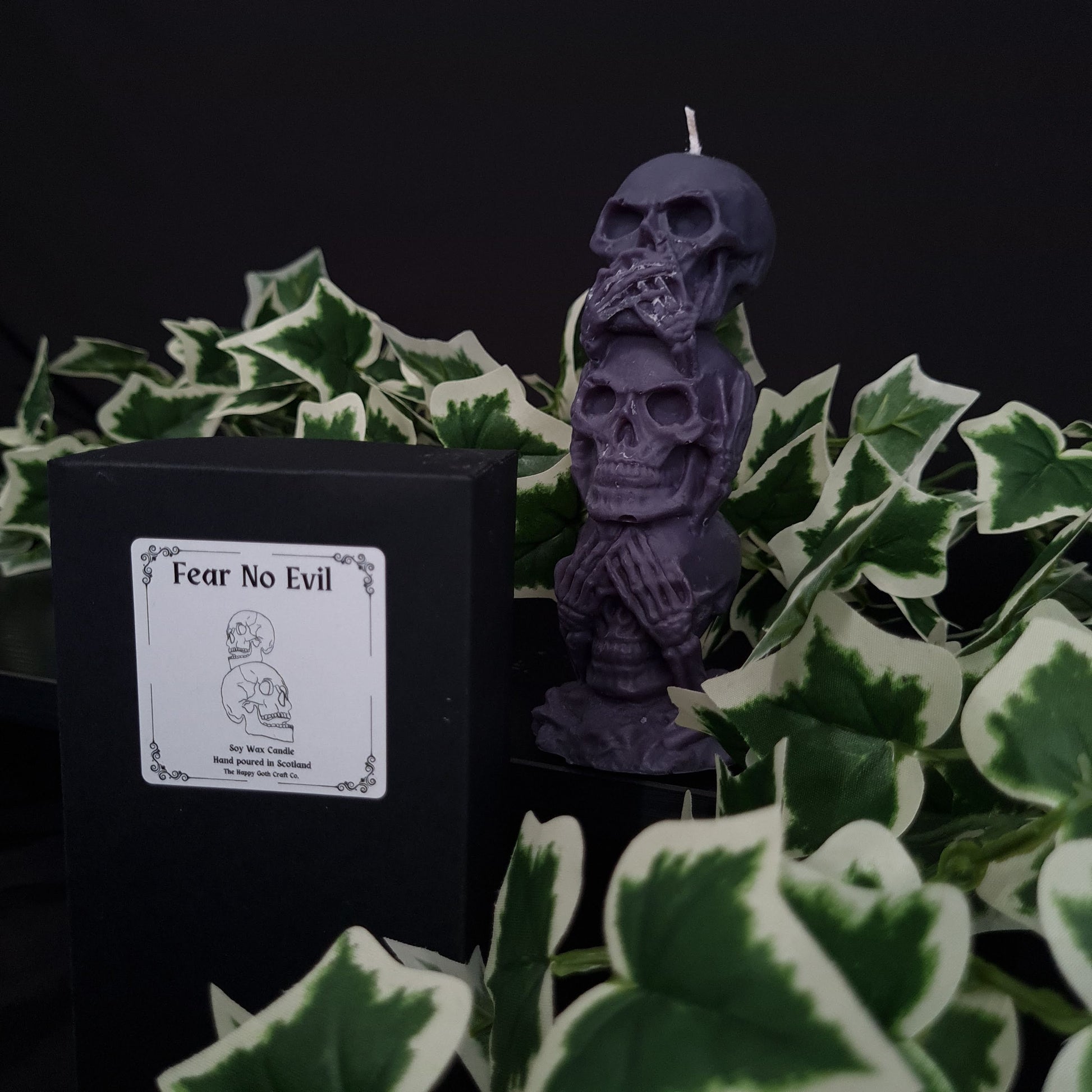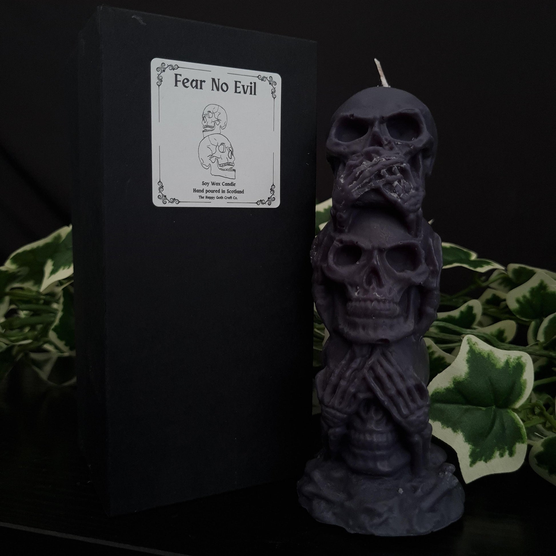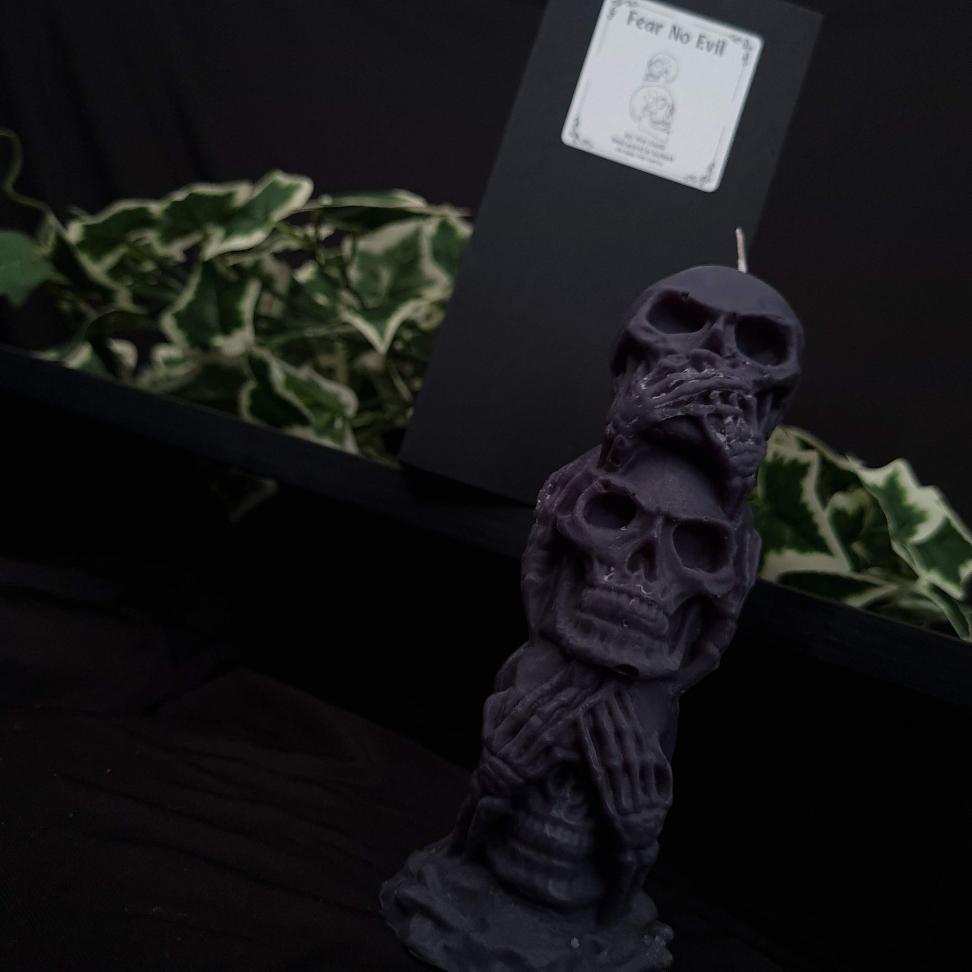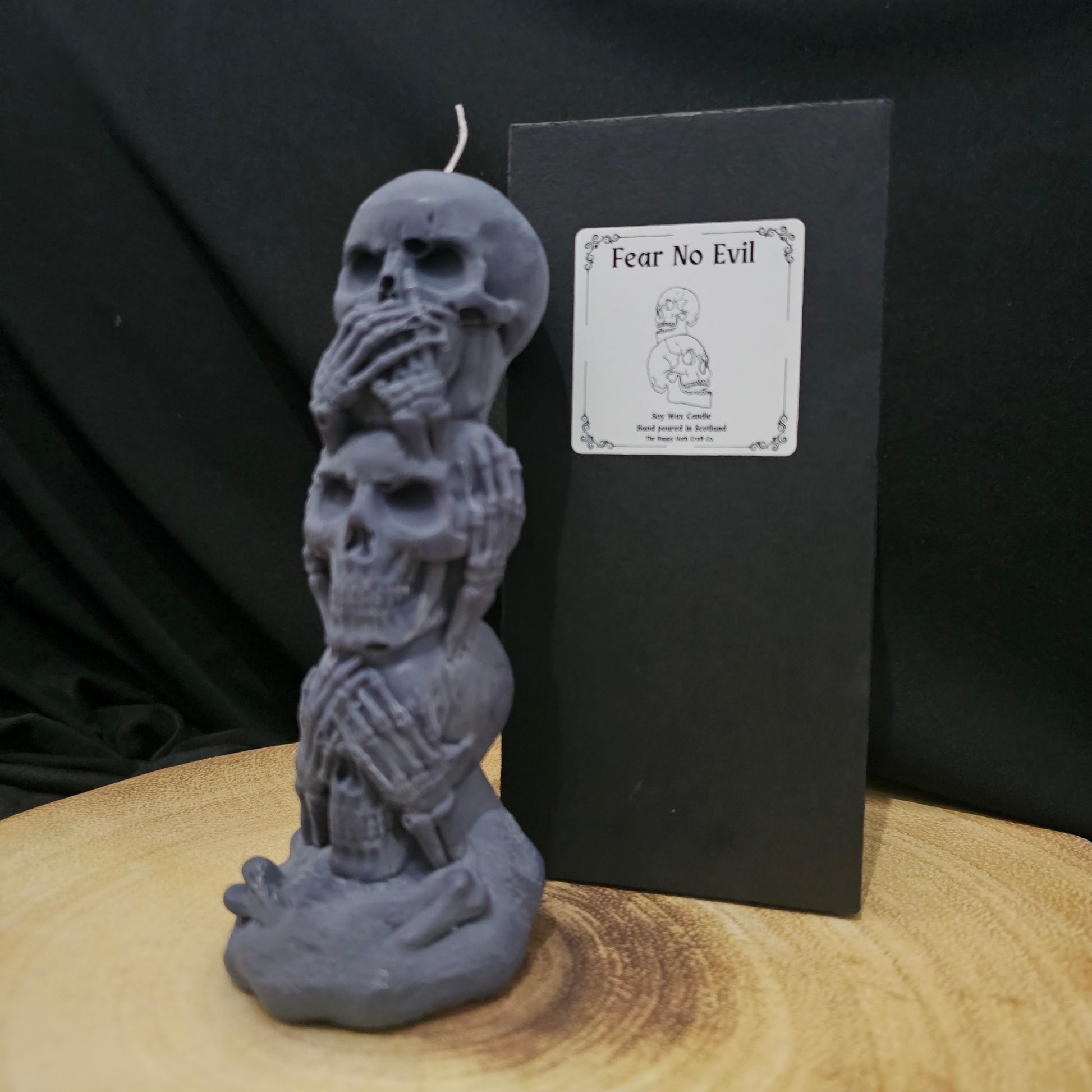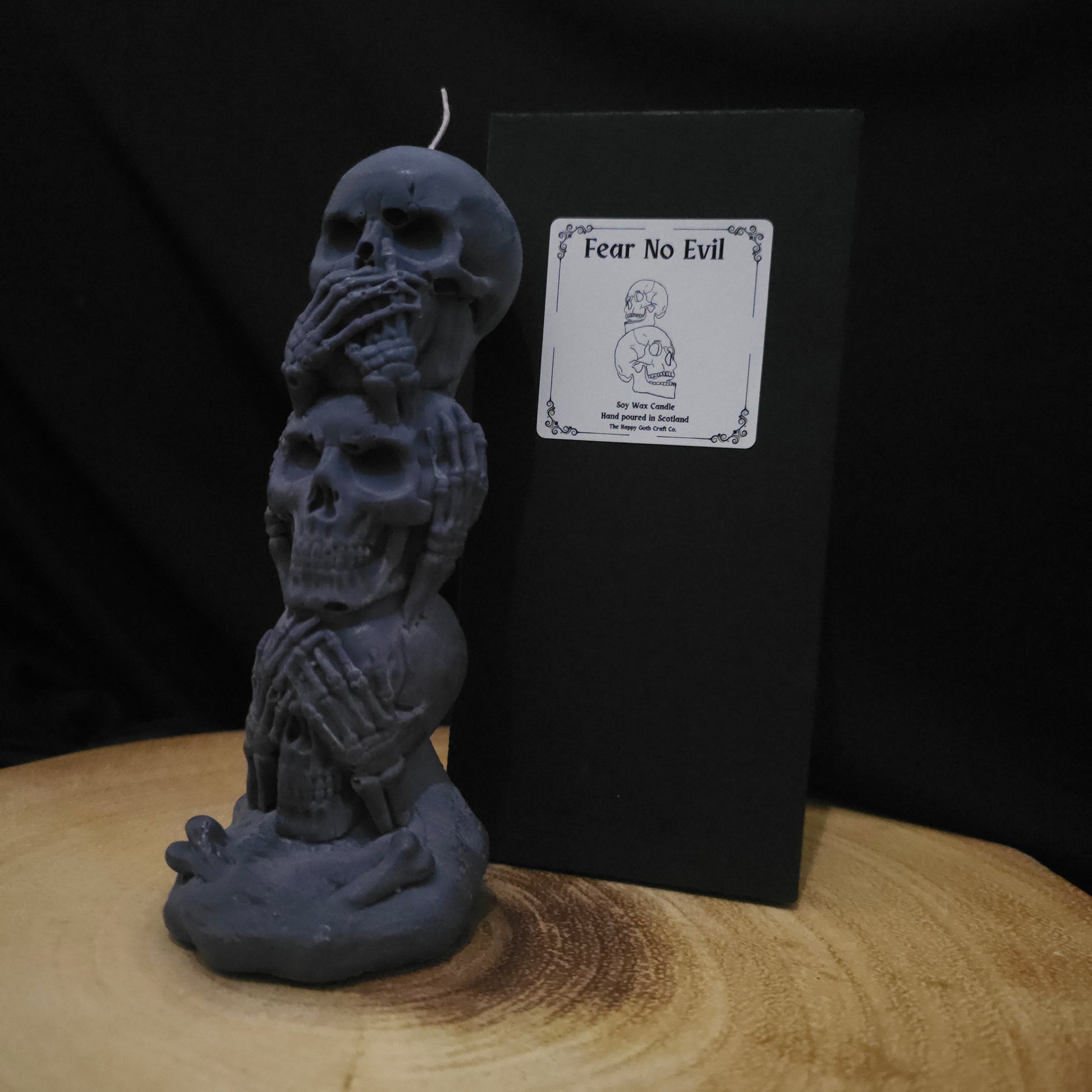 Standing nearly 7 inches tall, Fear No Evil features a trio of skulls inspired by the classic see no evil, hear no evil, speak no evil motif; reimagined in skeletal form. Hollow eyes, silent jaws, and bony hands create a sculpt that feels like a quiet warning.